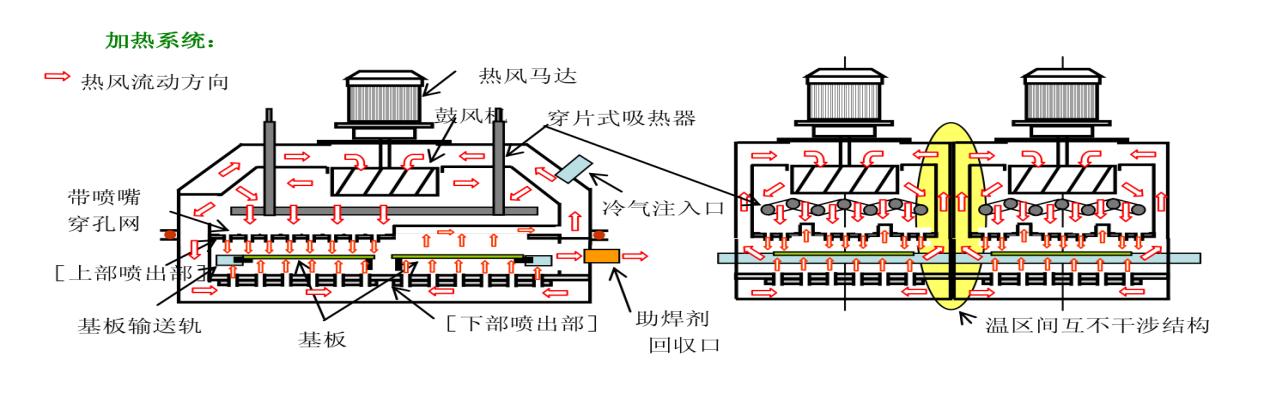 采用世界領先的熱風循環技術,合理運用熱風循環經過渦輪增壓使得熱風均穩;熱效率循環使用率高 即節能又穩定,PCB大量通過時,其每一塊PCB上的溫度曲線與僅一塊板通過時的溫度曲線永遠一致,加熱的重復精度極高,非常適合無鉛工藝中工藝空間較小的特點.(通過進口爐子技術改進) |